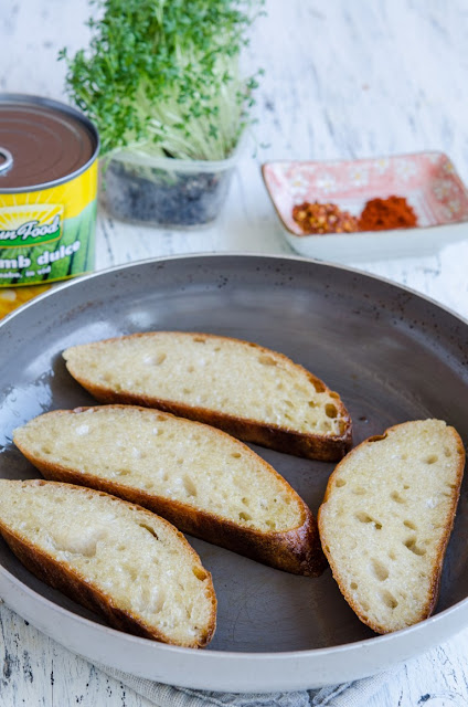prajiti-le la foc mic cateva minute pe fiecare parte. Scoateti feliile de paine pe o farfurie si lasati-le deoparte.