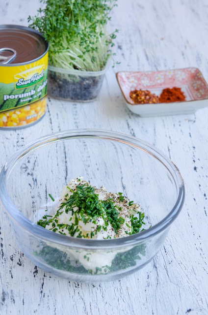 Pentru inceput desfaceti conserva de porumb, scoateti boabele intr-o sita si treceti sita printr-un jet de apa. Scurgeti bine de tot boabele de porumb dupa care puneti-le pe prosoape de hartie absorbanta si zvantati-le bine de tot.