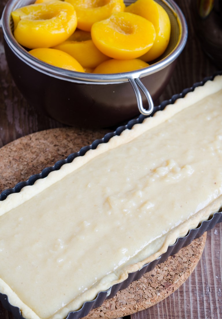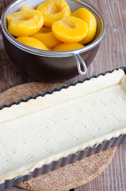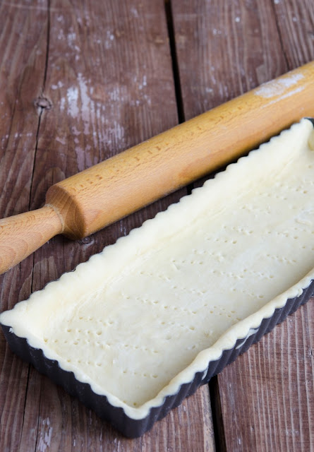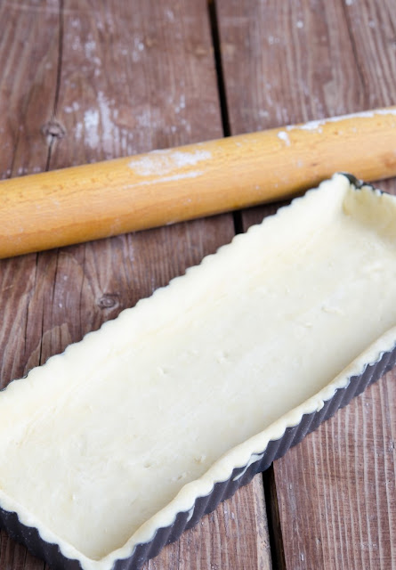 Incingeti cuptorul la 180 grade Celsius. Scoateti aluatul din frigider si intindeti o foaie subtire de 0.5 cm. Intindeti aluatul in forma de tarta si nivelati-l bine.