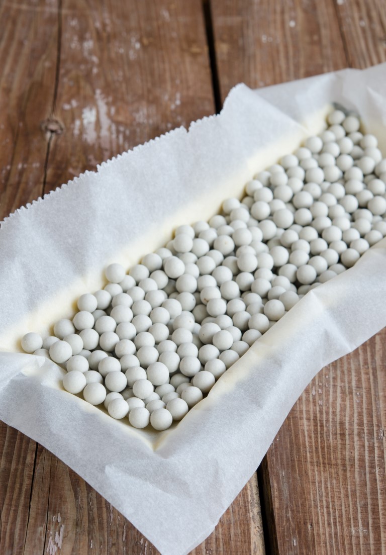 apoi acoperiti aluatul cu hartie de copt si bilute de ceramica. Daca nu aveti bilute de ceramica puteti pune alte greutati precum boabe de orez, boabe de fasole, naut…etc. Dati tava la cuptorul incins pentru 20 de minute.