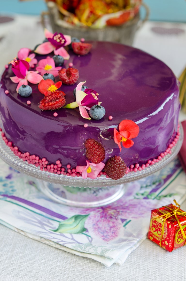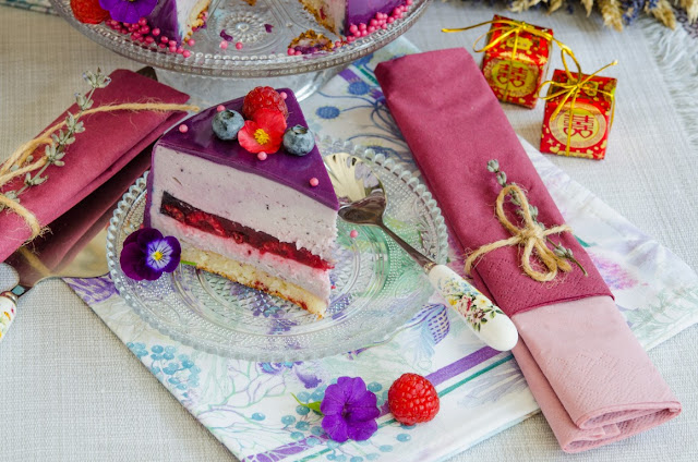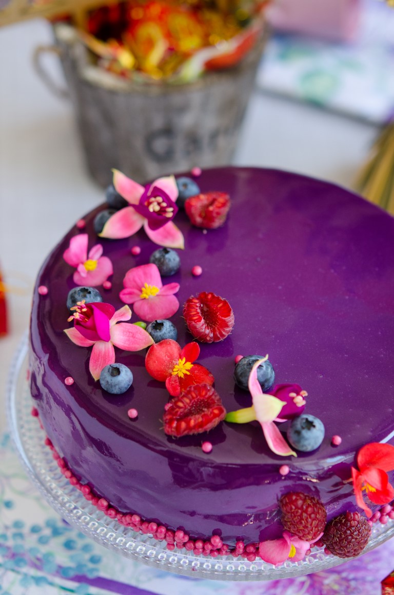Ok, acum sa va spun despre tort. Ne-am dorit sa fie un desert usor, aerat, dragut, floral, festiv in acelasi timp, dar mai ales gustos. Bineinteles ca am ales o tenta de lila , un mousse usor de afine, un blat daquoise, cu o insertie de zmeura, apa de trandafiri si sampanie, iar pe deasupra o glazura oglinda mov (putin cam prea mov! 🙂 ), ornat cu flori comestibile de la