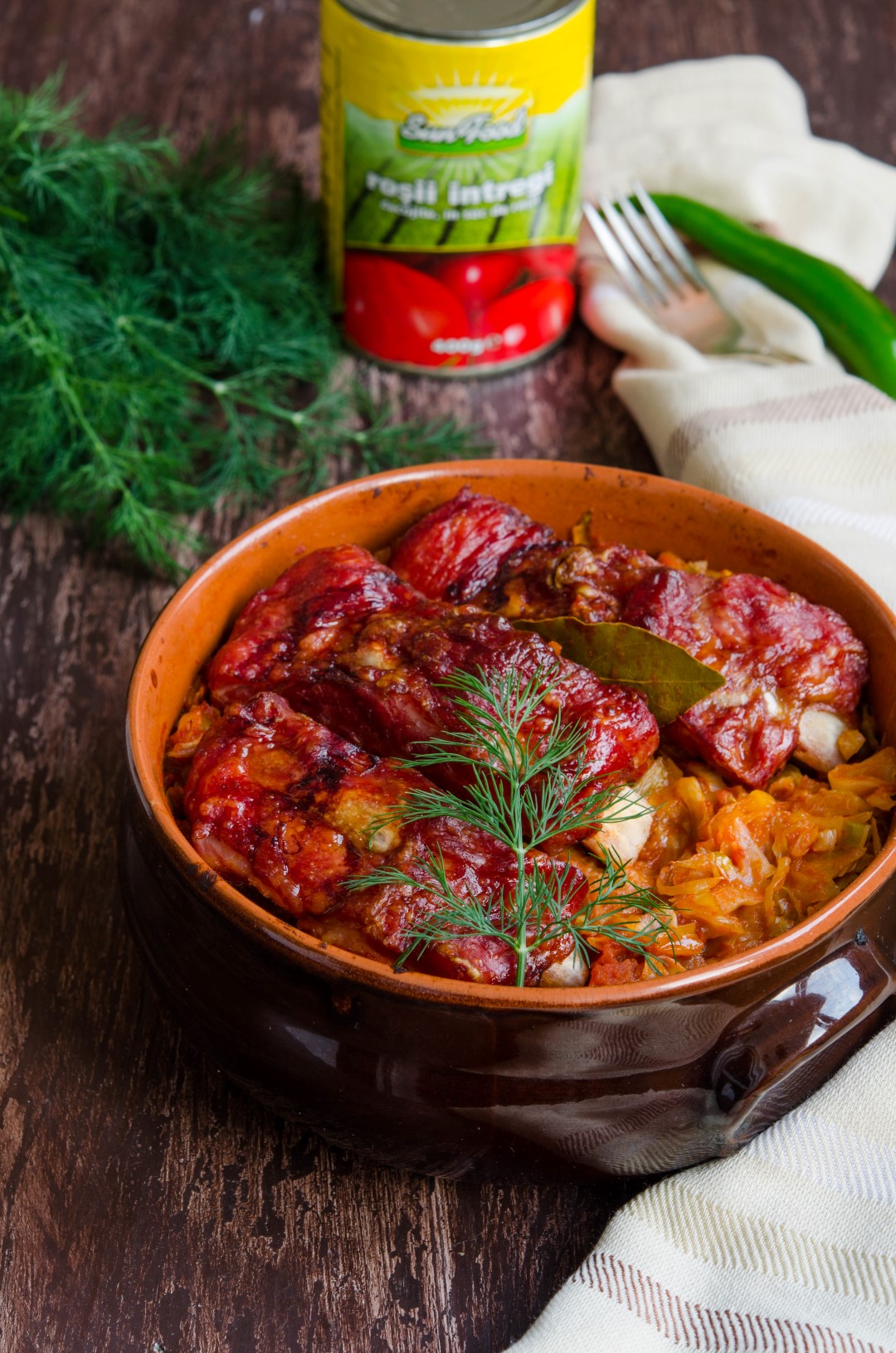 Varza cu rosii si costita afumata este mancarea romaneasca pe care o preparam foarte des la noi acasa. Adesea se intampla ca sa ne ramana in frigider varza proaspata de la o salata de varza si sa nu apucam sa o mancam, astfel incat ne hotaram sa o transformam in varza gatita. Este atat de buna si de versatila! De multe ori facem varza picanta sau cu un iz usor afumat cand punem putina boia afumata. Dar in cele mai multe cazuri punem afumatura, carnati sau pulpe de rata. Bineinteles ca voi puteti face acasa aceasta varza si fara carne alaturi de mamaliga, pentru zilele de post, sau puteti pune carne separat. De multe ori folosim varza proaspata, ci nu din cea murata. Am mai vazut cazuri in care unii pun in mancare jumatate varza proaspata si jumatate murata, pentru putina acreala. Eu prefer varza proaspata pe care sa o acresc cu lamaie. Tot pentru putin gust acrisor si aspect placut, vara pun rosii proaspete. Cum, vara deja si-a luat la revedere de la noi, in aceasta perioada pun in varza rosii de la conserva, mai exact rosiile intregi la conserva de la SunFood.