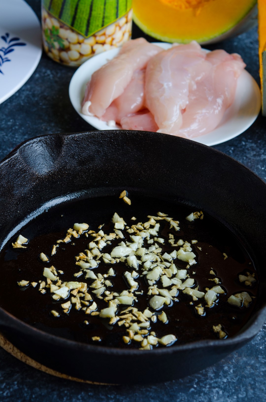 Incingeti o tigaie grill sau o tigaie simpla, ungeti bine cu ulei de masline. Puneti bucatile marinate de pui si pe o parte a tigaii si bucatile de dovleac fiert la aburi.