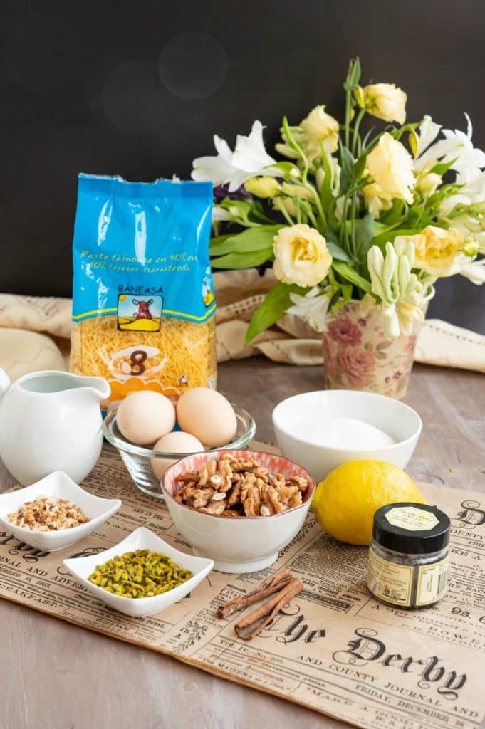 Kataiful clasic are in componenta sa paste subtiri speciale facute pentru acest tip de desert si am mai vorbit despre el si in postarea mea de acum cativa ani denumita Kataifi. Insa pentru ca aceste paste speciale nu se gasesc in toate magazinele, ci in general la magazinele cu specific turcesc sau arabesc, am decis sa incerc sa folosesc fideaua cu ou (din cea subtire) de la Baneasa.