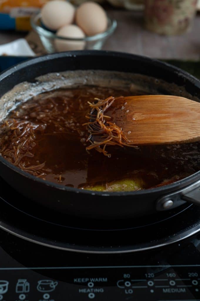 Nu plecati de langa tigaie, ci amestecati incontinuu caci fideaua tinde sa se arda repede! Adaugati apa, zaharul, batonul de scortisoara si coaja de la lamaie. Aveti nevoie de fasii din coaja de lamaie, caci le veti indeparta dupa accea, deci nu radeti pe razatoare coaja de lamaie! Ca sa taiati fasiile de coaja de lamaie, va puteti folosi de un curatator de cartofi.