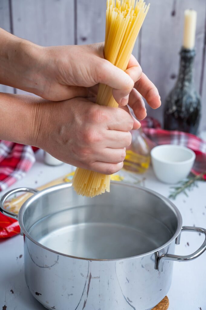 Fierbeti pastele: puneti pe foc o oala plina cu apa si 1 lingura de sare. Aduceti apa la punctul de fierbere si adaugati pastele.