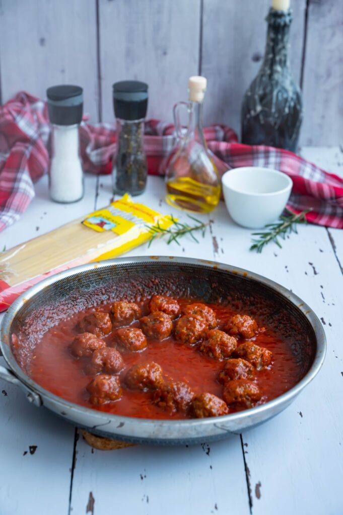 Gatiti pentru 1 minut, apoi adaugati sosul de rosii. Condimentati cu sare si piper, amestecati bine si lasati sa fiarba la foc mic pentru 5 minute. Peste sos puneti chiftelele gatite si amestecati bine, lasati sa fiarba pentru 10 minute la foc mic pana ce pregatiti pastele.