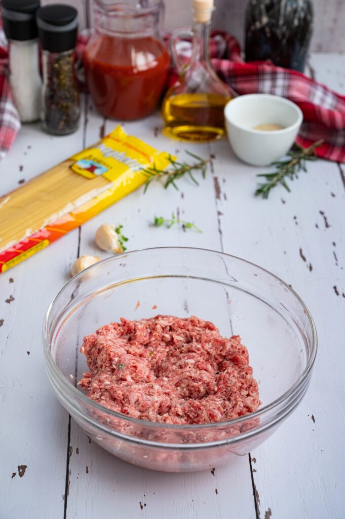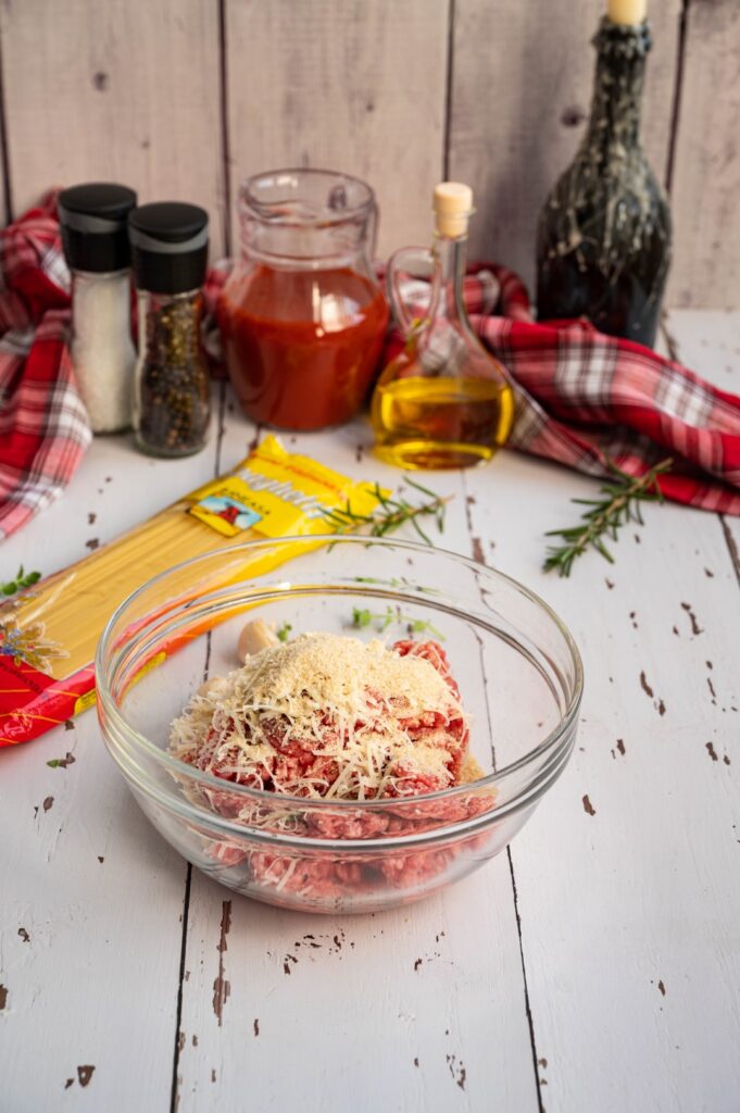 Pregatiti chiftelele: intr-un bol puneti carnea peste care adaugati sare si piper, usturoiul zdrobit, pesmetul, parmezanul ras, oregano proaspat, pesmetul si parmezanul ras.