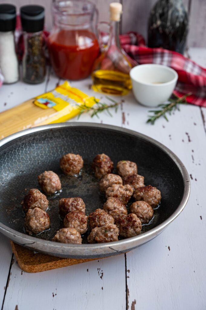 Intr-o tigaie incingeti 4 linguri ulei de masline. Gatiti chiftelutele pe toate partile pana ce acestea sunt rumene. Scoateti-le pe o farfurie si lasati-le deoparte.