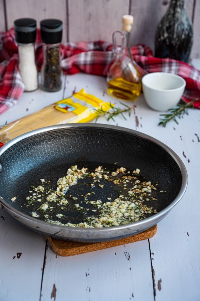 Pregatiti sosul de rosii: intr-o tigaie incingeti uleiul de masline, adaugati usturoiul tocat si rozmarinul tocat marunt.