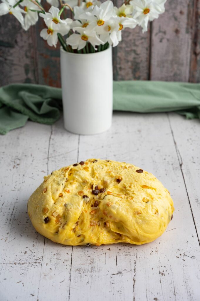In vasul unui mixer planetar,  puneti galbenusurile impreuna cu sarea, zaharul si zaharul vanilat (sau semintele de la pastaia de vanilie). Fixati paleta tip „frunza” si mixati pana ce galbenusurile se deschid la culoare. Adaugati aluatul oparit (si racit) impreuna cu laptele ramas, drojdia activata, coaja rasa de lamaie, coaja rasa de portocala, sarea si amestecati din nou. Continuati sa adaugati treptat faina cernuta lingura cu lingura pana ce reusiti sa incorporati toata faina.