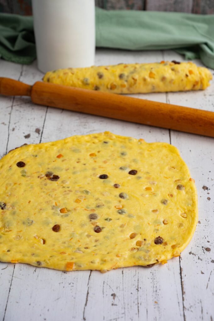 Incorporati in aluat fructele uscate: stoarceti bine de tot fructele hidratate si lasati-le deoparte. Scoateti aluatul din vas si intindeti-l pe blatul de lucru. Folositi un sucitor si intindeti aluatul intr-un patrat mare, avand grija sa nu il rupeti. Presarati pe toata suprafata aluatului fructele hidratate si stoarse foarte bine. Pliati toate laturile spre centru ca pe un plic, apoi pliati plicul pe jumatate. Intindeti cu sucitorul aluatul astfel pliat si pliati din nou aluatul astfel incat sa aveti fructele distribuite uniform.