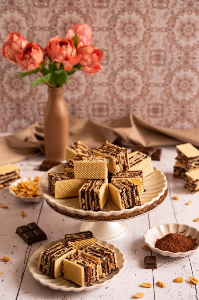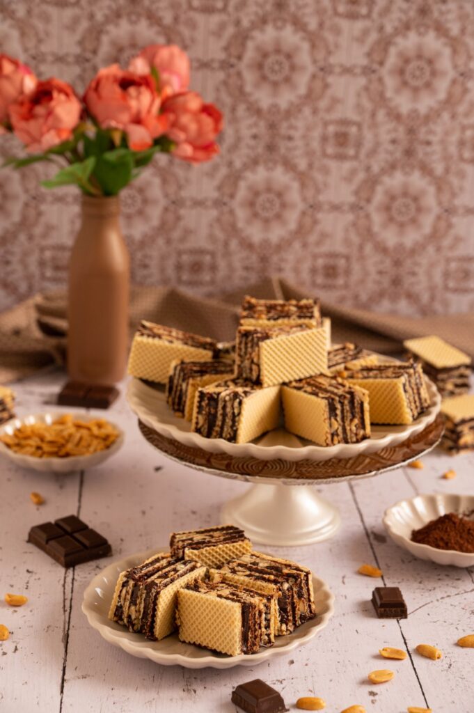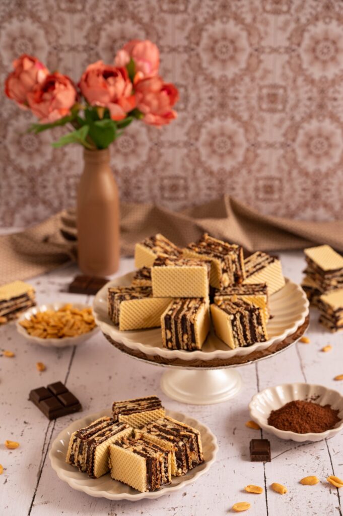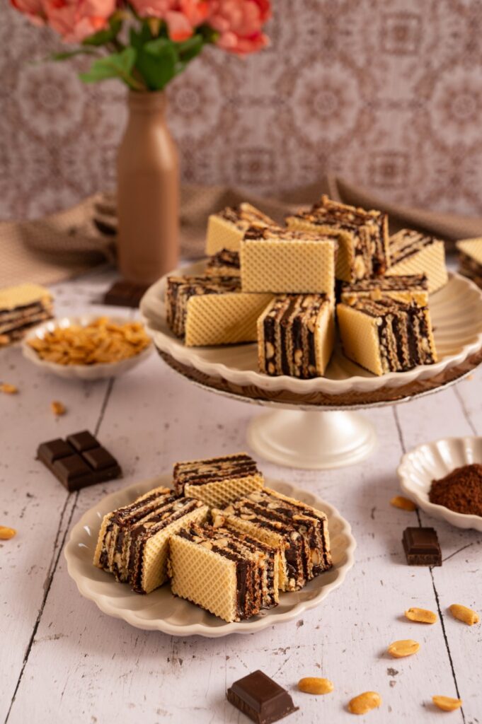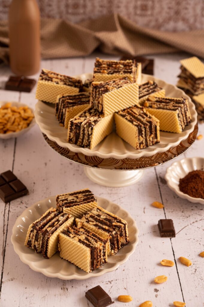Indepartati greutatile de pe foi, taiati napolitanle cu ciocolata si arahide in bucati si savurati!