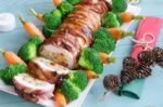 Serviti rulada de curcan cu naut alaturi de morcovi sotati in unt si buchetele de broccoli